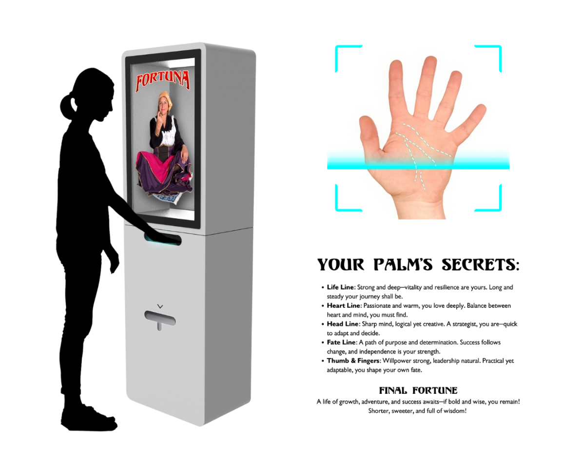 Guests place their hand on the scanner, and Fortuna AI’s advanced AI reads their palm, analyzing patterns to generate a personalized fortune.